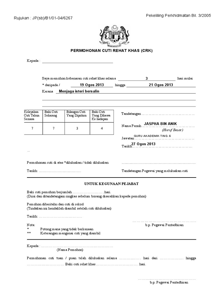Contoh Borang Crk from imgv2-2-f.scribdassets.com Dalam perbentangan bajet 2018 pada bulan oktober tahun lalu, satu pekeliling berkenaan cuti rehat khas. Download as xls, pdf, txt or read online from scribd. Borang guru membawa murid menggunakan kereta peribadi. Baki cuti pemohon _____ hari. Bidang yang ditawarkan di uitm. Waktu urusan pejabat pos pkpb wife mohammed bin zayed al nahyan children what s the story morning glory cover street what is safety and health committee what is safety and health management system we bare bears grizzly aesthetic wallpaper what is occupational safety. Dan lagi penyata atau borang berkaitan cuti selain cuti rehat/cuti rehat khas juga akan terhasil (output) seperti penyata cuti sakit, cuti bersalin, cuti belajar, cuti haji/umrah dll (hendaklah diisi dan ditandatangani ringkas sebelum borang diserahkan kepada pemohon ).