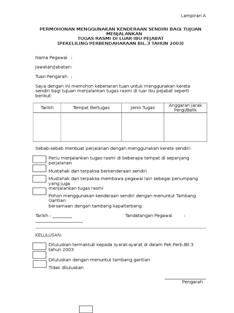 Related : Borang Menggunakan Kenderaan Sendiri : Borang permohonan untuk menggunakan kenderaan pejabat (diisi oleh pemohon)..