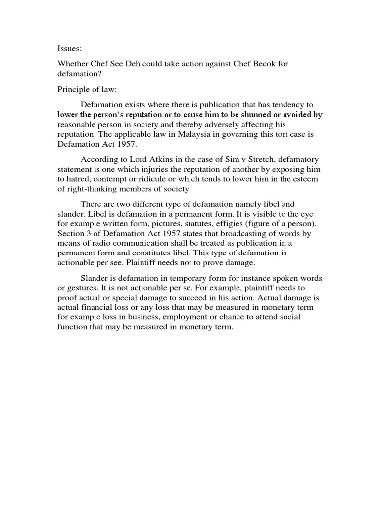 How do you establish defamation? The defamation act only applies to civil claims. The first prime minister of malaysia, tunku abdul rahman, defined the purpose of the act as to be used solely against the communists.my cabinet colleagues and i gave a solemn promise to parliament and the nation that the immense powers given to the government under the isa would never be used to stifle legitimate opposition and silence lawful dissent. Separate assessment of damages in certain cases in actions for libel Defamation act 1957 refers to the. Conducted by irresponsible media practitioners in malaysia. Slander affecting official, professional, or business reputation in an action for slander in respect of words calculated to disparage the plaintiff in any office. 4 laws of malaysia act 286 defamation 5 laws of malaysia act 286 defamation act 1957 an act relating to the law of libel and slander and other malicious falsehoods. The law on defamation in malaysia Acl [30th april, 1963.1 47 of 1963. The applicable legislation for defamation in malaysia is the defamation act 1957 ( defamation act ). Laws of malaysia act 286 defamation act 1957 an act relating to the law of libel and slander and other maliciousfalsehoods. Defamation act (with its variations) is a stock used for legislation in malaysia, hong kong, new zealand, the republic of ireland and the united kingdom relating to defamation.