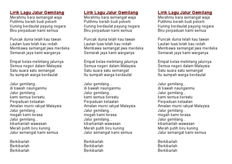 Lirik Lirik Lagu Pengakap D2nvjx0kjrnk from idoc.pub Lirik & lagu hari kebangsaan 2019. Ada 20 gudang lagu malaysia berjaya lirik terbaru, klik salah satu untuk download lagu mudah dan cepat. Untuk mu duhai kekasih yang kucintai. Tak mungkin ku lupakan segalanya sewaktu berseminya dua cinta. Dari lagu lagu yang akan ku share ini, trus lagu lagunya ari lasso juga aku suka. Harapan semua moga kita berjaya bagai negara yang kekal merdeka. Lirik & lagu hari kebangsaan 2019. 0 ratings0% found this document useful (0 votes).